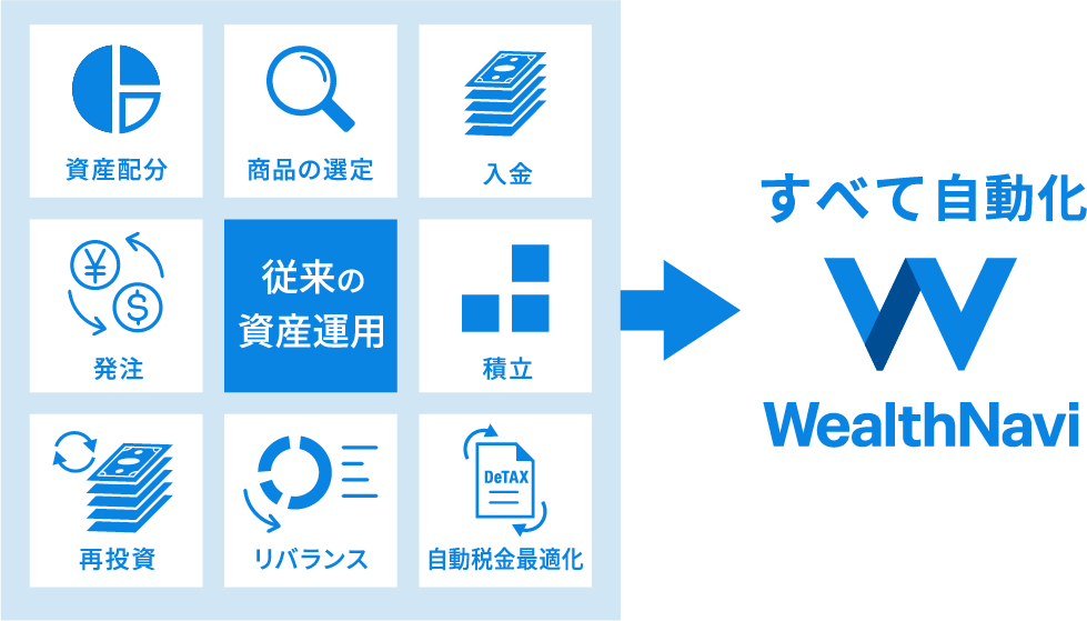 WealthNaviは、発注から積立、リバランス(資産のバランス調整)、「税金」の最適化※まですべて自動で行います。