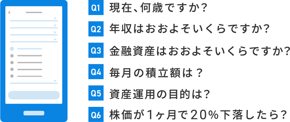 専門知識がなくても6つの質問に答えるだけで、あなたに合った運用プランをご提案、最適なポートフォリオを自動で構築します。